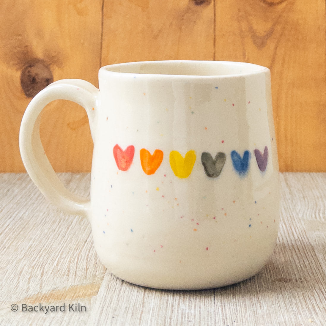 This mug was handmade by Taylor: thrown, trimmed, handled, detailed, fired, glazed, and fired again in our home studio. It features painted rainbow circles and rainbow speckles, with a rainbow of hearts running up the handle.