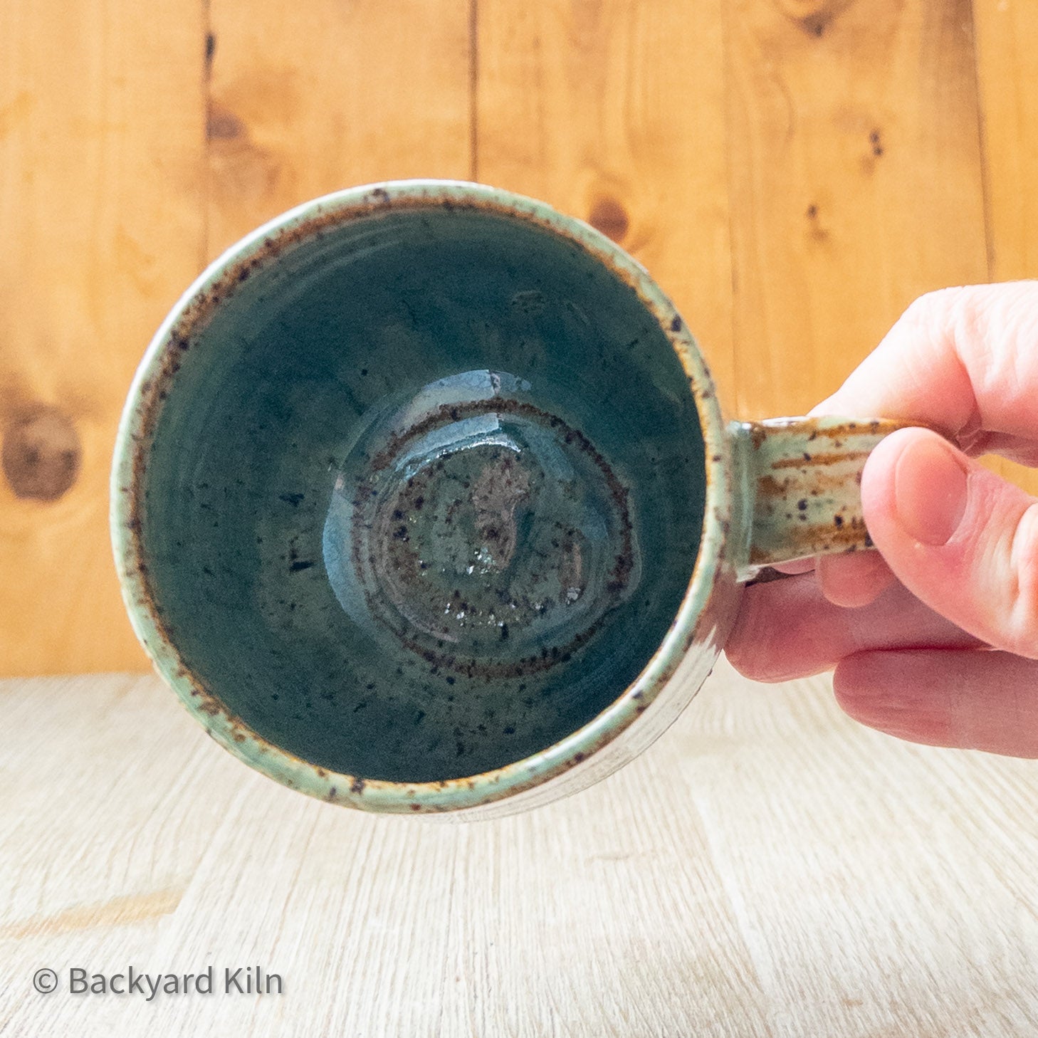 This irreverent mug was handmade by Taylor: thrown, trimmed, and handled, detailed, fired, hand painted, glazed, and fired again in our home studio. It is dishwasher and microwave safe. It holds about 10 oz of your favorite beverage.