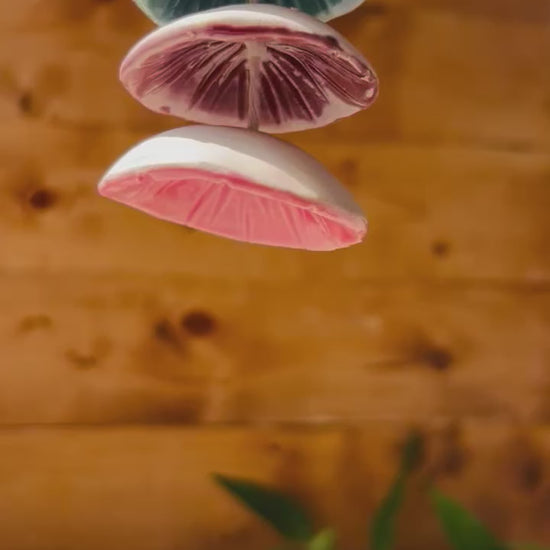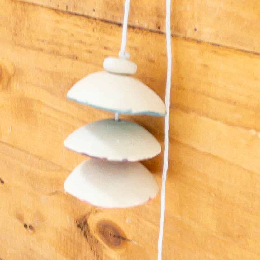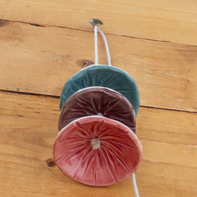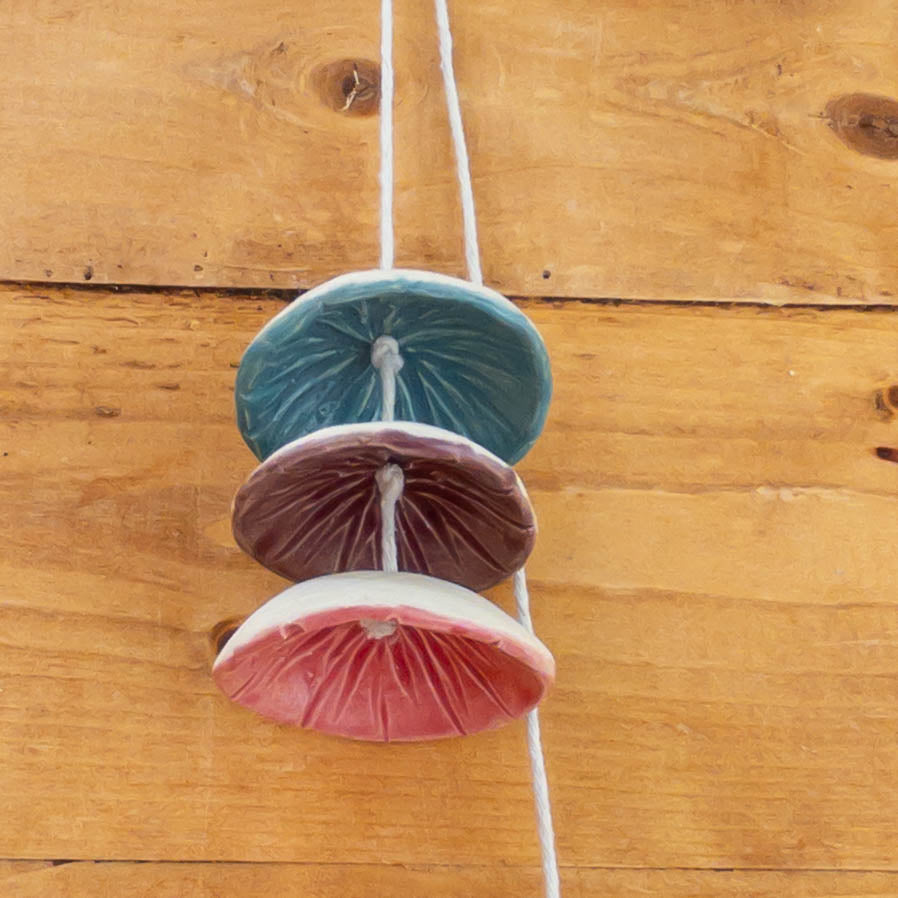 This wind chime was made in our home studio by Taylor, pinched, detailed, fired, glazed, and fired again, and hung on cotton cord.
