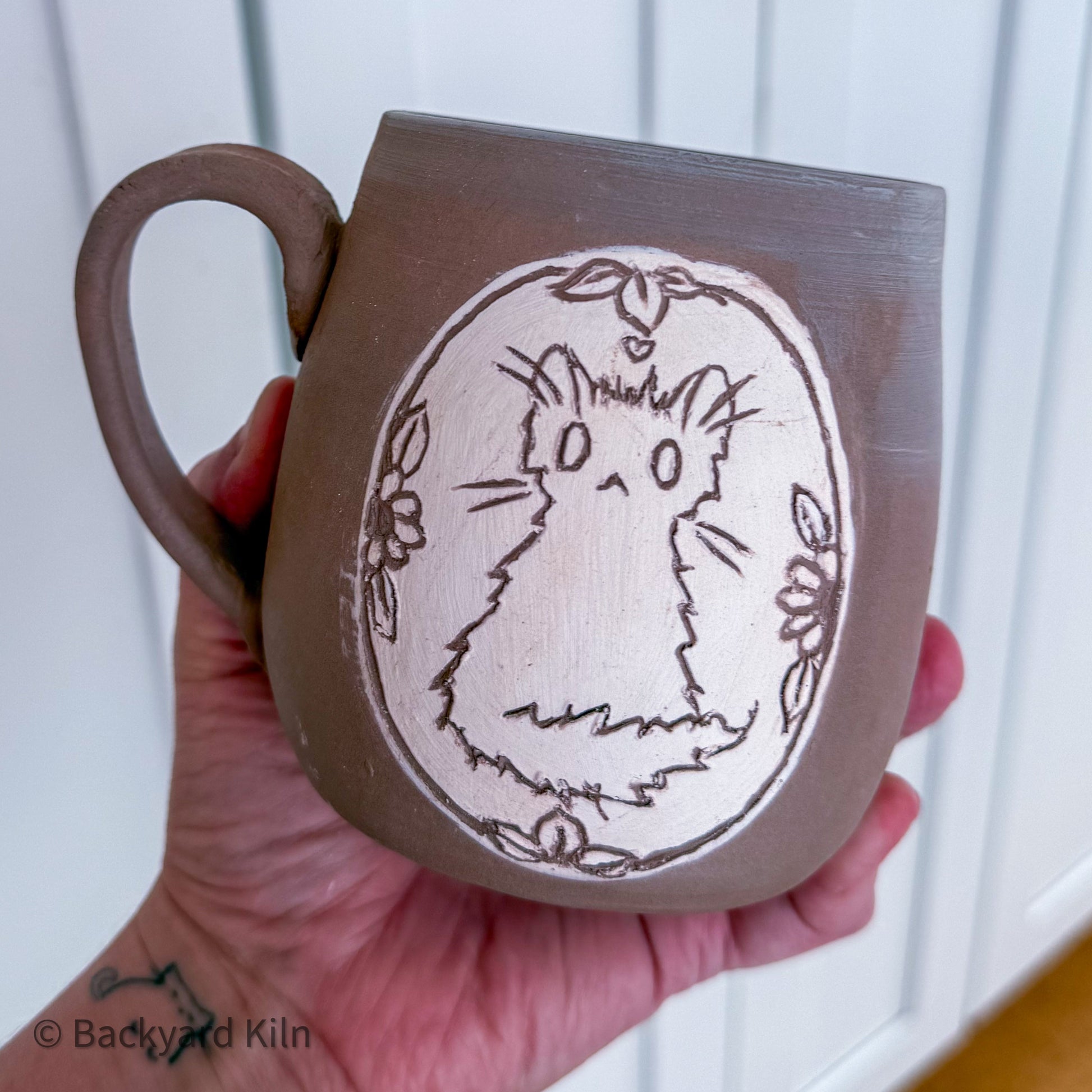 Please send me a photo of your cat with face and body markings showing and I will do my best to paint the cat on the mug to look like your cat. No changes to the shape of the cat can be made as the lines are already carved.