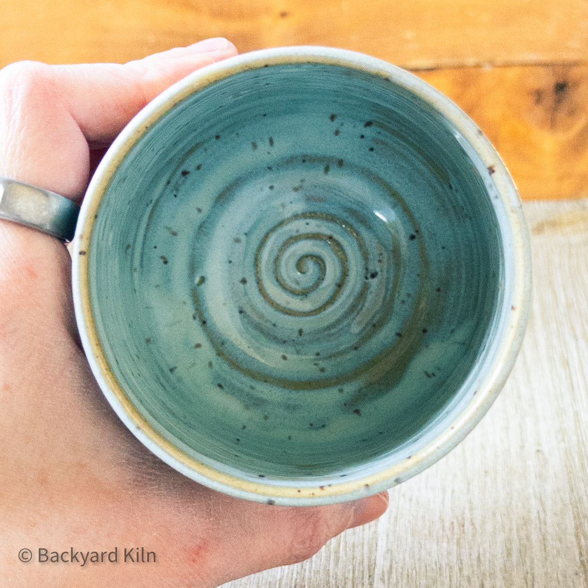 This cup was handmade by Taylor: thrown, trimmed, carved, painted, detailed, fired, glazed, and fired again in our home studio. It is dishwasher and microwave safe. It bears the paw print stamp of my best buddy Shy Guy, who passed away last spring, and the image of Penguin (and her bird namesake), who was one of our foster kittens, now off to a great home. It holds 14 oz.