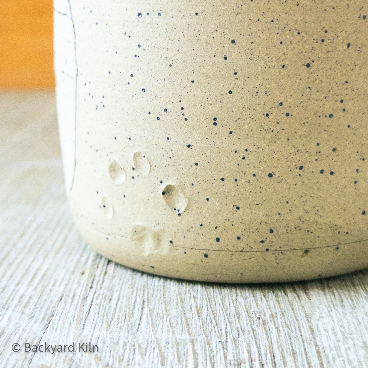 This cup was handmade by Taylor: thrown, trimmed, carved, painted, detailed, fired, glazed, and fired again in our home studio. It is dishwasher and microwave safe. It bears the paw print stamp of my best buddy Shy Guy, who passed away last spring, and the image of Puffin (and his namesake), who was one of our foster kittens, now off to a great home. It holds 13 oz.