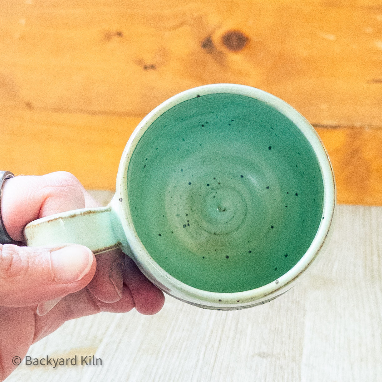 This piece was handmade by Taylor: thrown, trimmed, carved, painted, detailed, fired, glazed, and fired again in our home studio. It is dishwasher and microwave safe. It holds 7 oz of your favorite beverage.