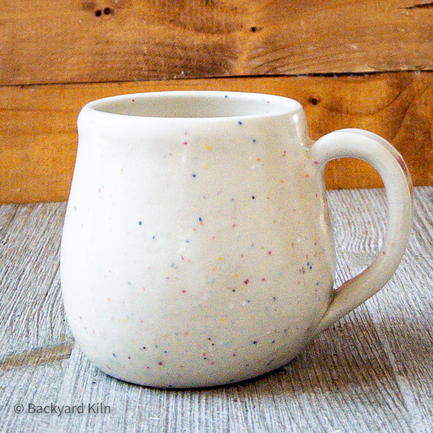 This mug was handmade by Taylor: thrown, trimmed, handled, detailed, fired, glazed, and fired again in our home studio. It features painted rainbow hearts and rainbow speckles, with a rainbow of hearts running up the handle.