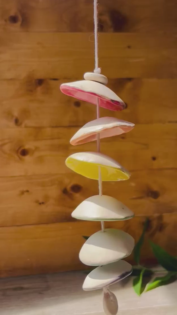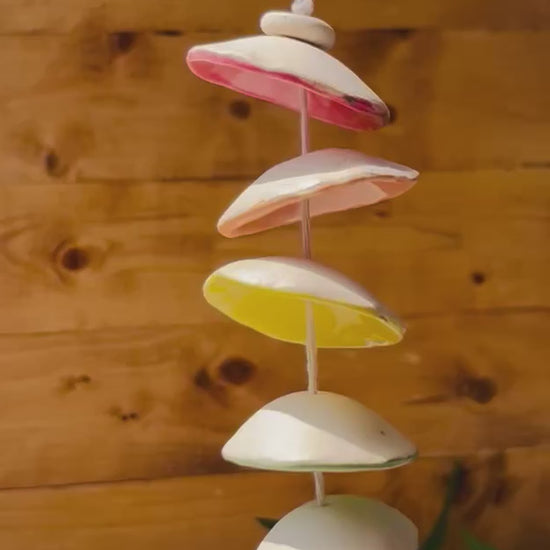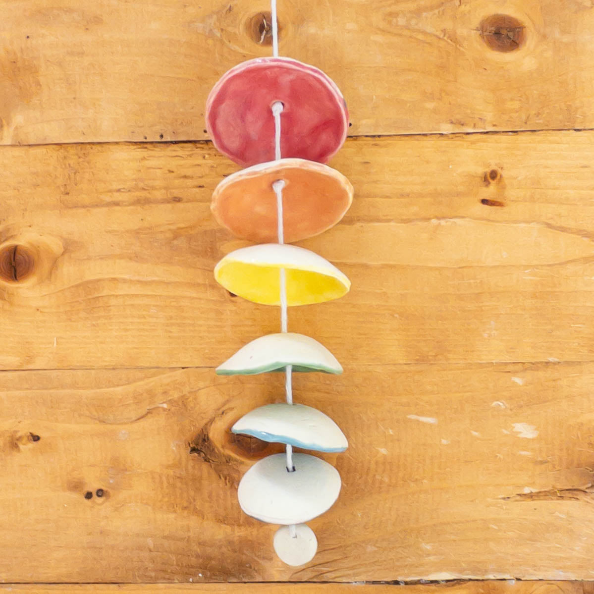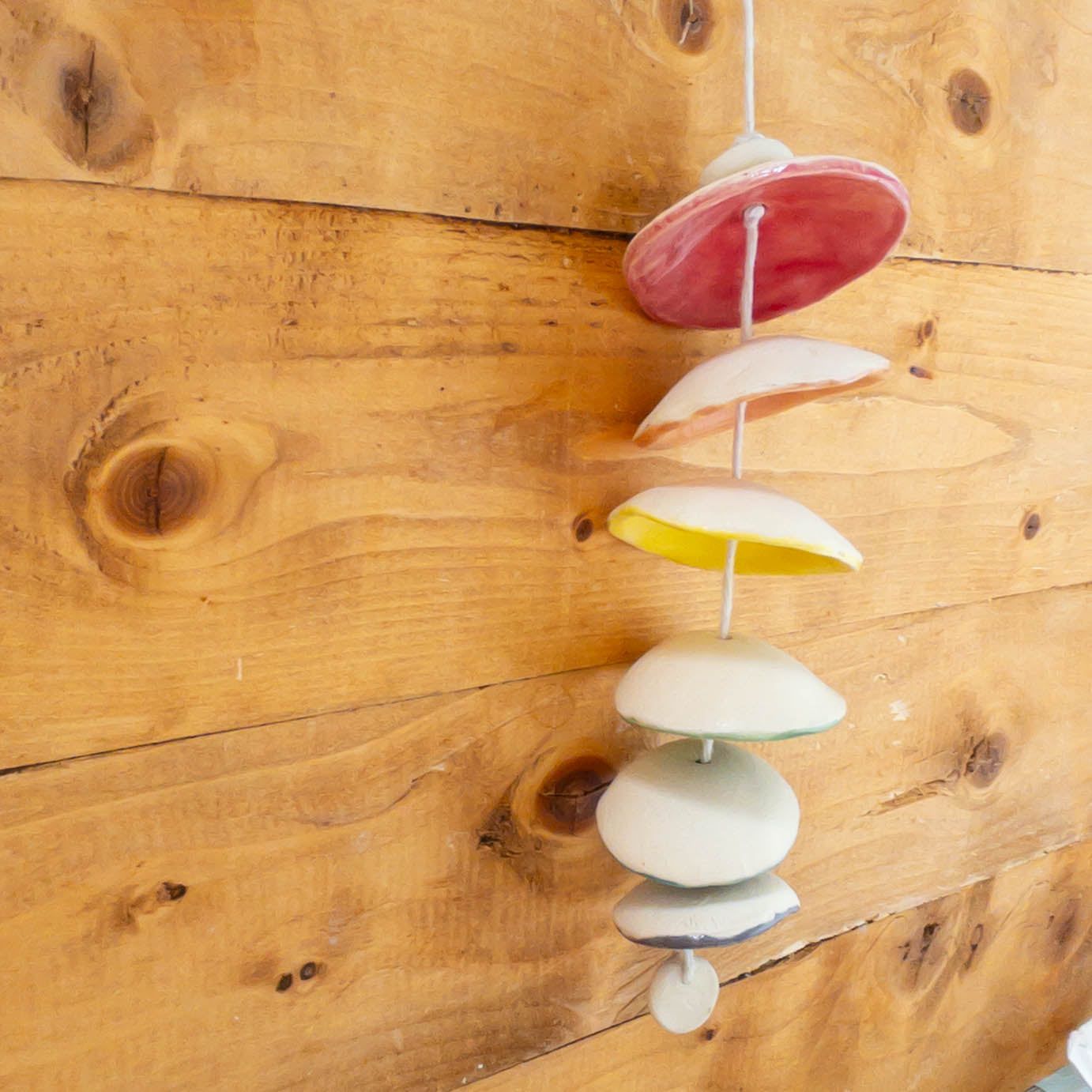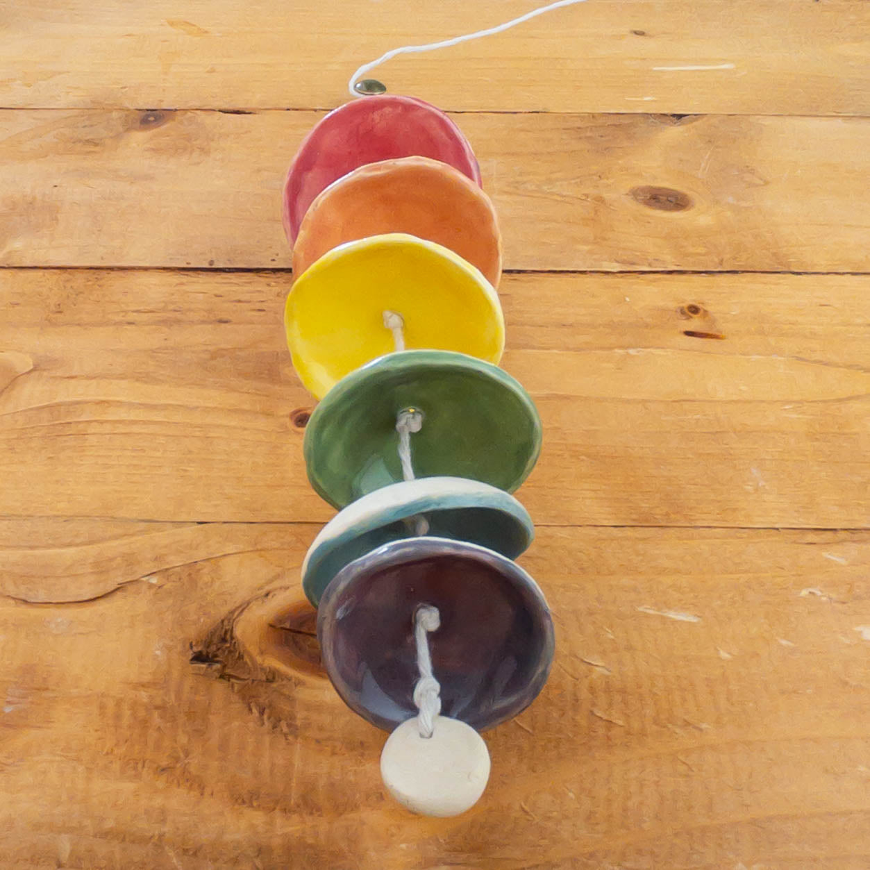 This wind chime was made in our home studio by Taylor, pinched, detailed, fired, glazed, and fired again, and hung on cotton cord with a handmade clapper.