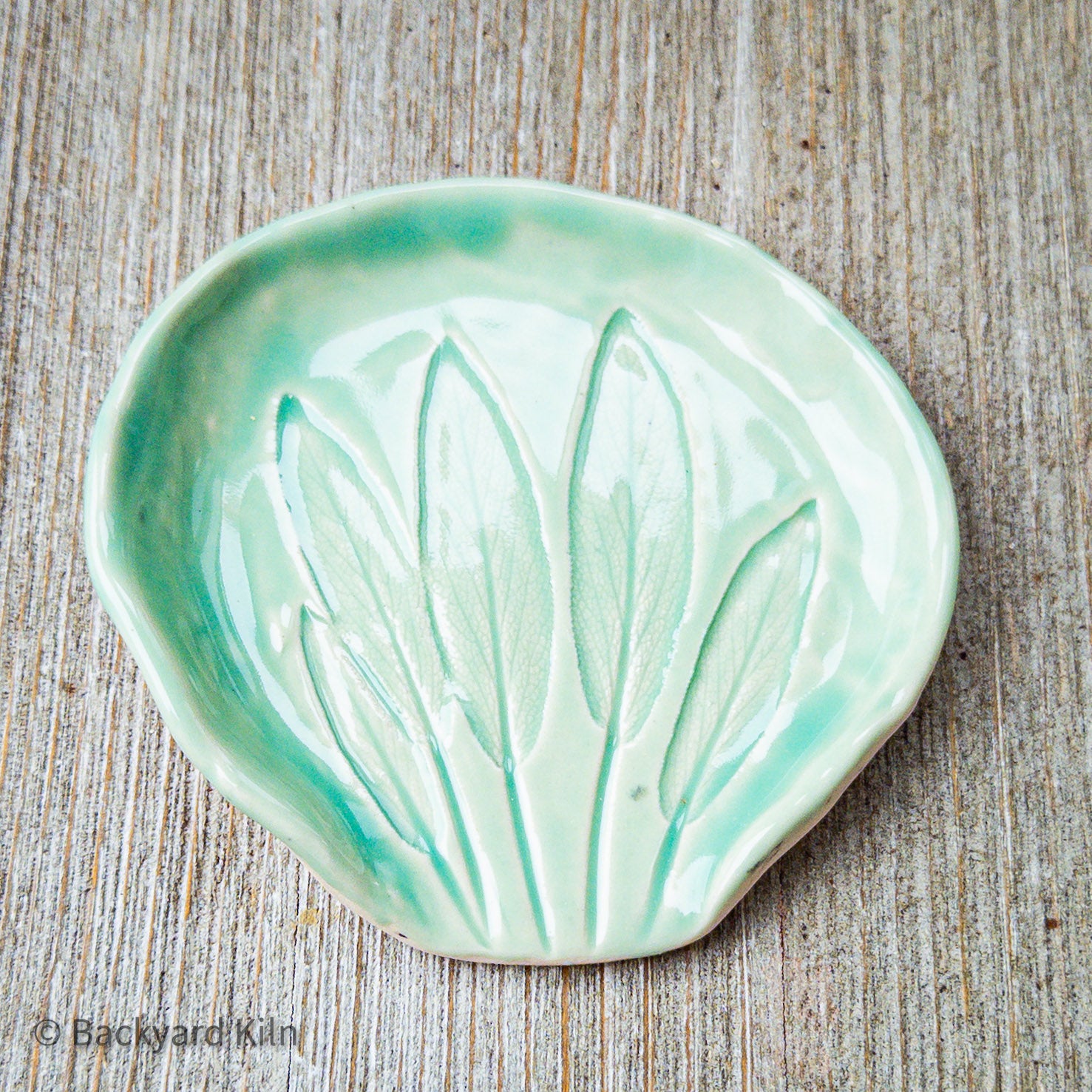 This spoon rest was made by Taylor with leaves from our garden; detailed, fired, glazed, and fired again in our home studio. Diameter measures a little less than 3.25”. Dishwasher safe.