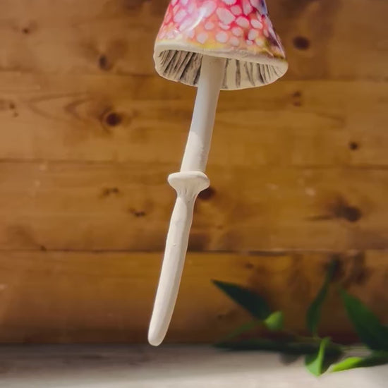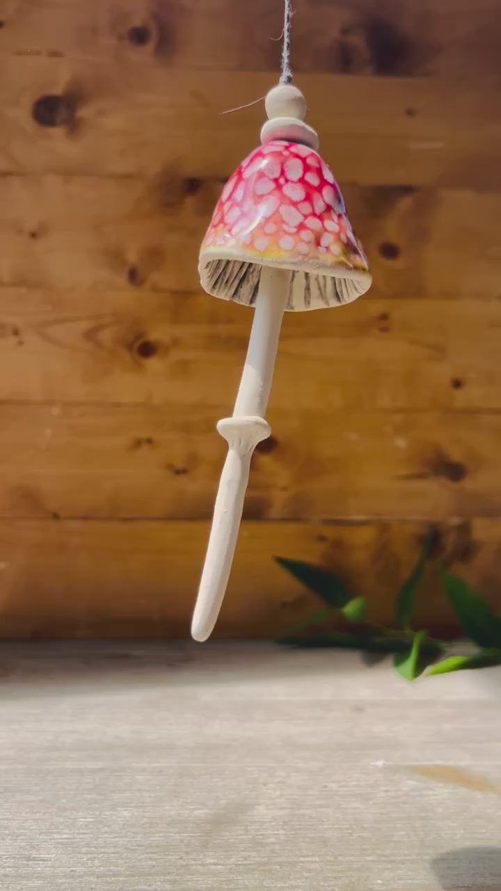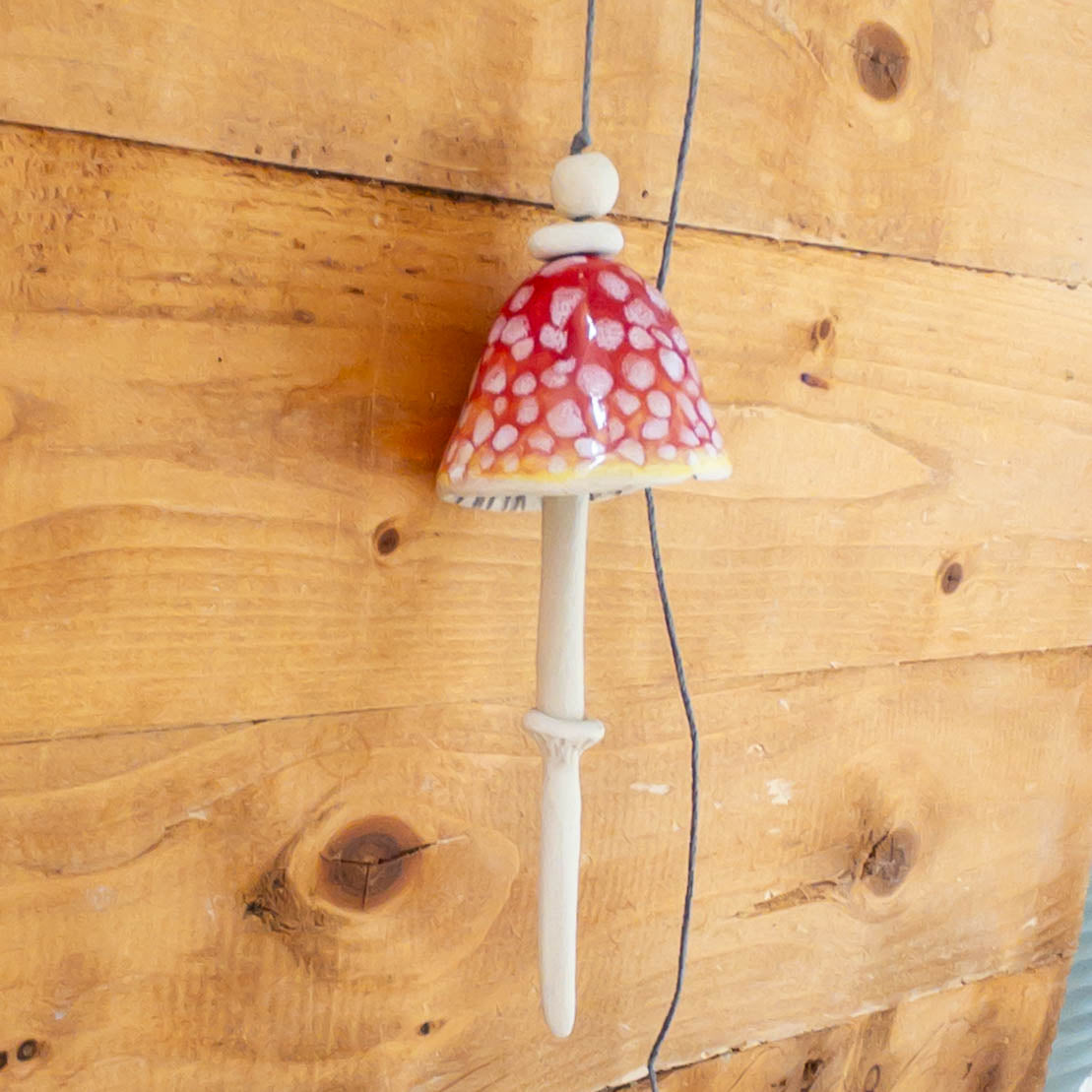 This wind chime was made in our home studio by Taylor, pinched, detailed, fired, glazed, and fired again, and hung on cotton cord with handmade bead clappers.